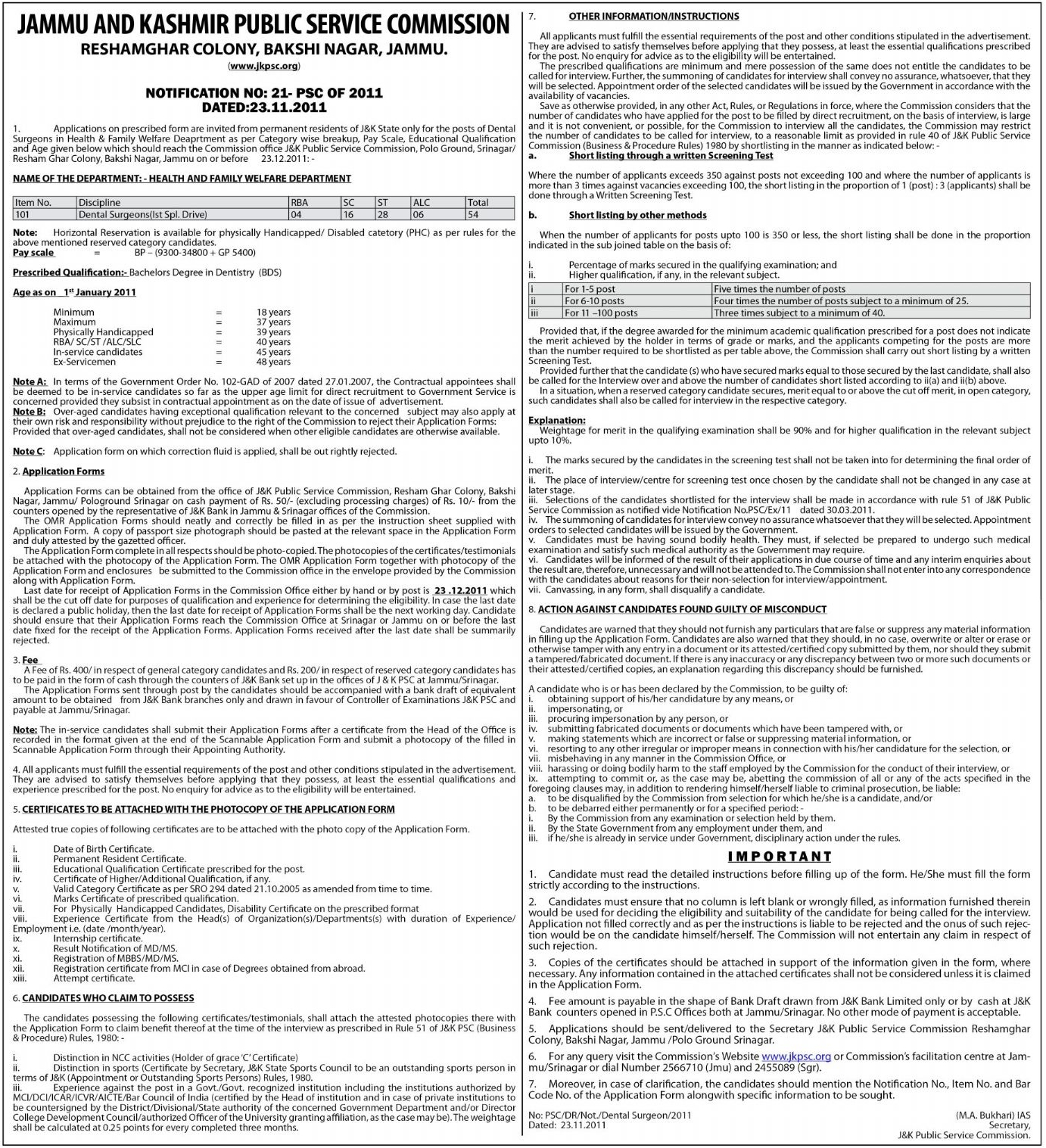 JKPSC Recruitment Notification 2011 for Dental Surgeons