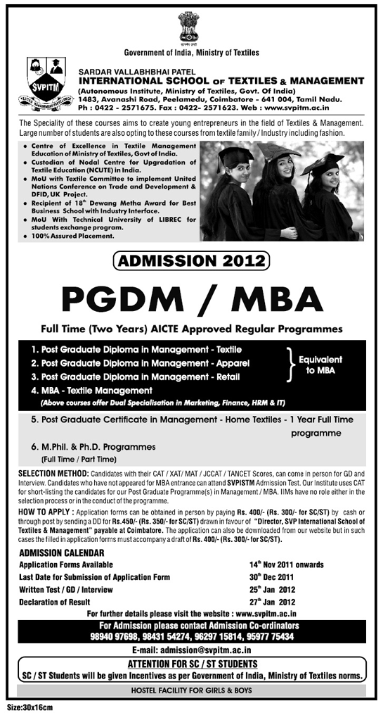 Sardar Vallabhbhai Patel International School Of Textiles & Management Admission to PGDM & MBA 2012